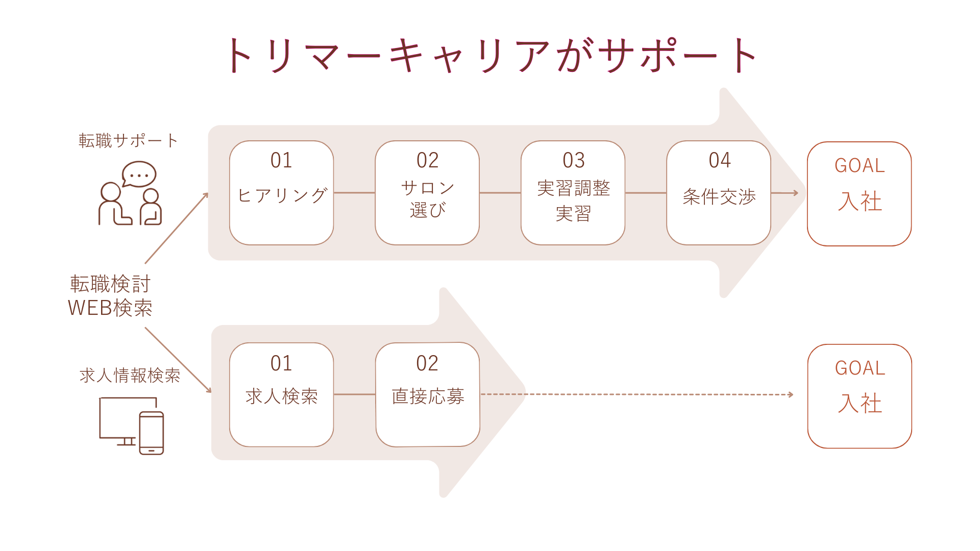 トリマーキャリアでは、さまざまなスタイルの転職活動に対応できるよう、2つの活用方法をご用意しています。