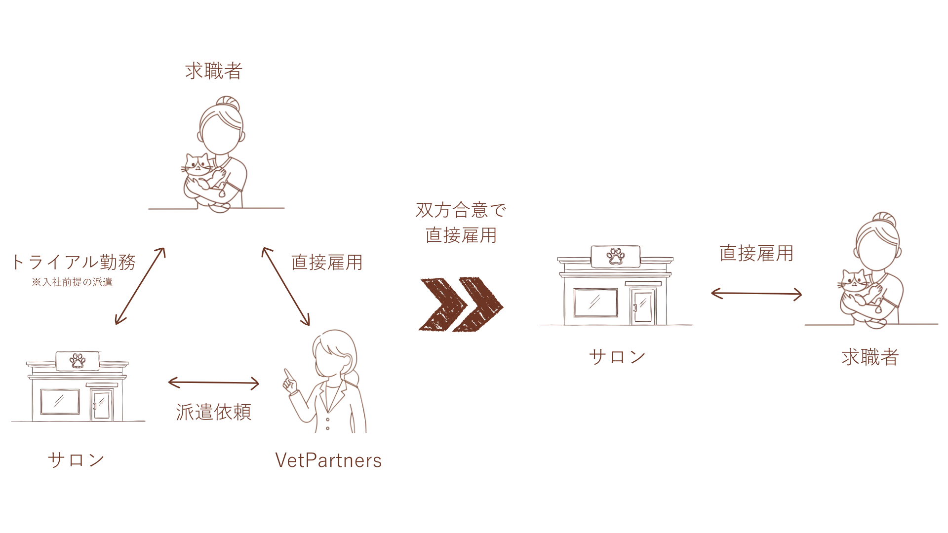まずはトリマーキャリア(当社VetPartners)と直接雇用契約を結びます。